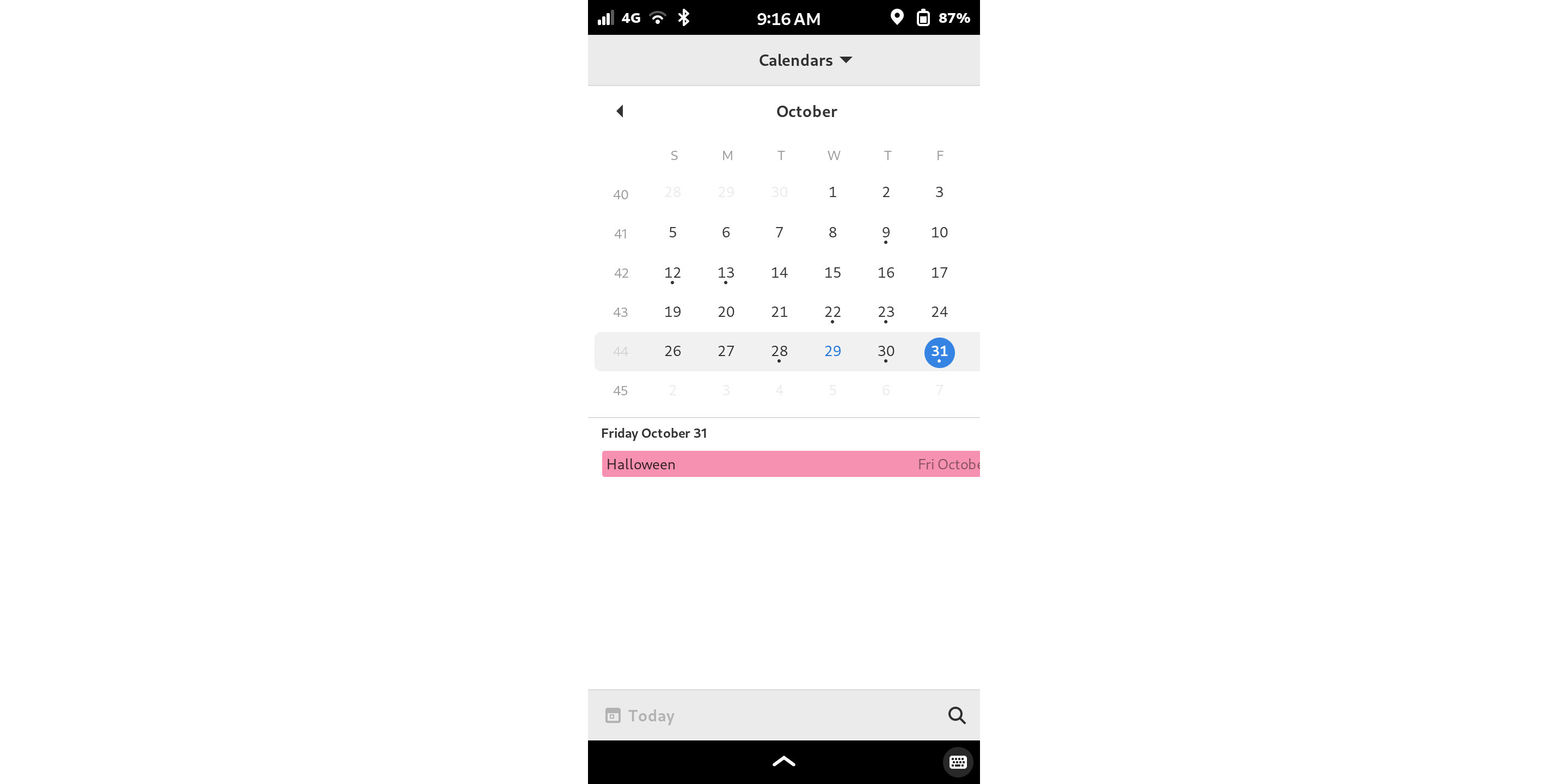 Saturday disappeared! (Or Sunday, if you are Monday-first!) Worse, there is no way to edit events in the small-screen layout. You could only edit events from the month/week views, which are only visible on much wider displays.